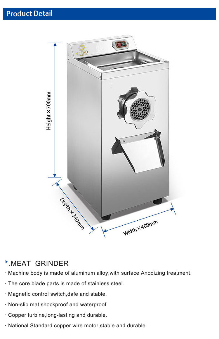 معدات الطبخ GLEAD PC32 مثالية لأي مطعم يريد طحن اللحوم بكفاءة. المنتج سهل الاستخدام والصيانة ، مما يجعله خيارا شعبيا للعديد من المطاعم.الآلة هي أيضا مناسبة لمحلات اللحوم الصغيرة والمتوسطة الحجم، لأنه يمكن طحن كمية كبيرة من اللحوم في فترة قصيرة.